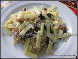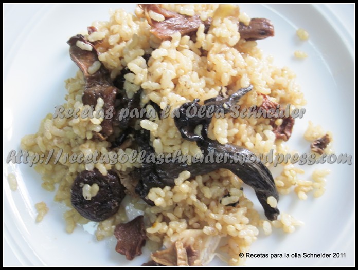 Se echa en la olla aceite, un ajo, la pechuga de pollo troceada y un puñado de setas variadas deshidratadas. Después de rehogar, añadir el arroz integral, y cubrir con agua. Sazonar con sal y una pastilla de caldo vegetal. Cerramos la olla y programamos el menú pollo.