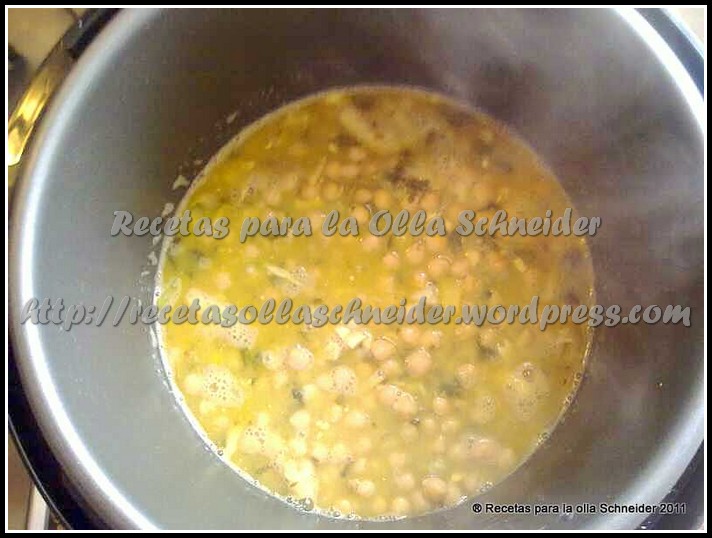 Con la olla abierta, se hace un refrito con la cebolla y los ajos bien picados. Una vez dorados, se añade una cucharada de pimentón y rápidamente el agua (para que no se queme el pimentón). Se incorporan los garbanzos, una hoja de laurel, el azafrán y el colorante. NO ECHAR SAL.