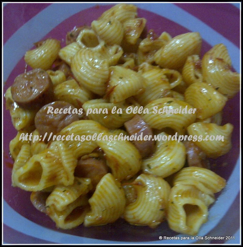 Con la olla abierta, programar arroz y calentamos el aceite con el perejil y el ajo. Mientras, trocear las salchichas y sofreírlas un poco. Añadir el tomate y los macarrones, mezclar bien y, añadir agua hasta cubrir (pero que se vean los picos). Salar al gusto y programar menú arroz.
