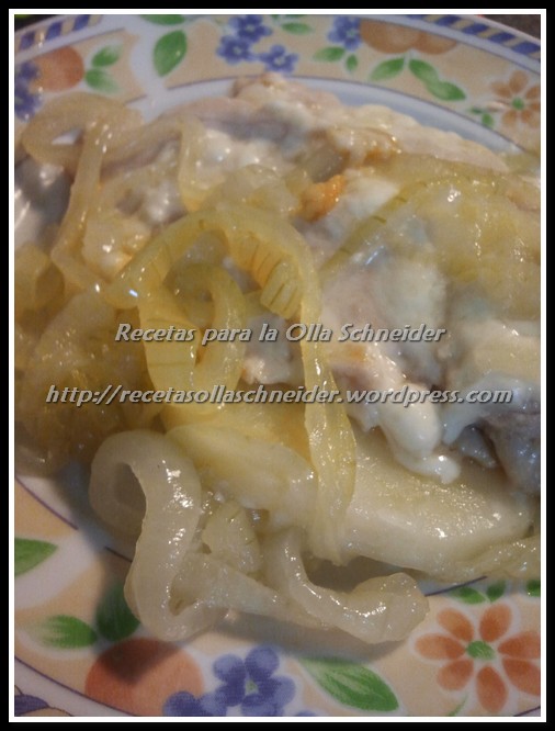 EDICIÓN 10/10/2012. Mejorando la receta con un toque de cebolla. Antes de los pasos de la receta, doramos (con cualquier programa) una cebolla cortada en aros y reservamos. Después de hacer las «capas» de pollo, queso, patatas, queso…, ponemos encima de todo la cebolla. Cerramos la olla, menú pollo ¡y riquísimo!