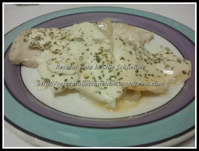 Sobre un chorrito de aceite, y con cualquier menú, se sofríen las pechugas, salpimentándolas al gusto. Una vez cojan un poco de color, se pone encima una capa de queso para fundir. Sobre éste, patatas cortadas en rodajas muy finas (también salamos al gusto), y una nueva capa de queso para finalizar. Se espolvorea con perejil y se cierra la olla. Anulamos el programa que hubieramos puesto para sofreir y programamos el menú pollo. Se sirve bien caliente, con el queso derretido a modo de salsa.