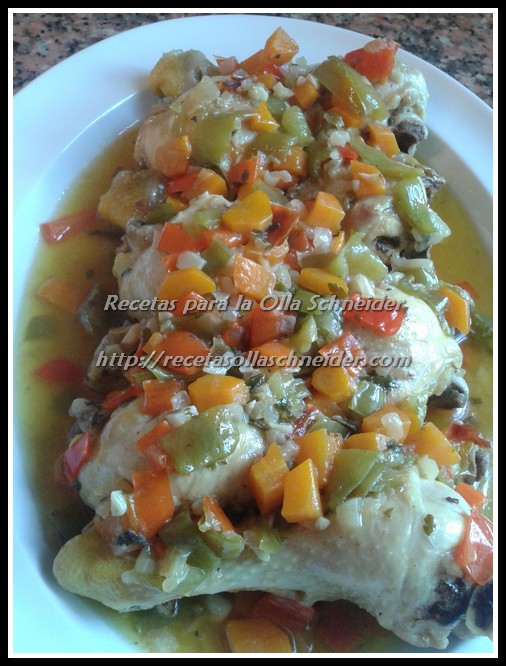Con la olla abierta, programar cualquier menú y sobre un chorro de aceite, dorar los muslos de pollo, salpimentando al gusto.