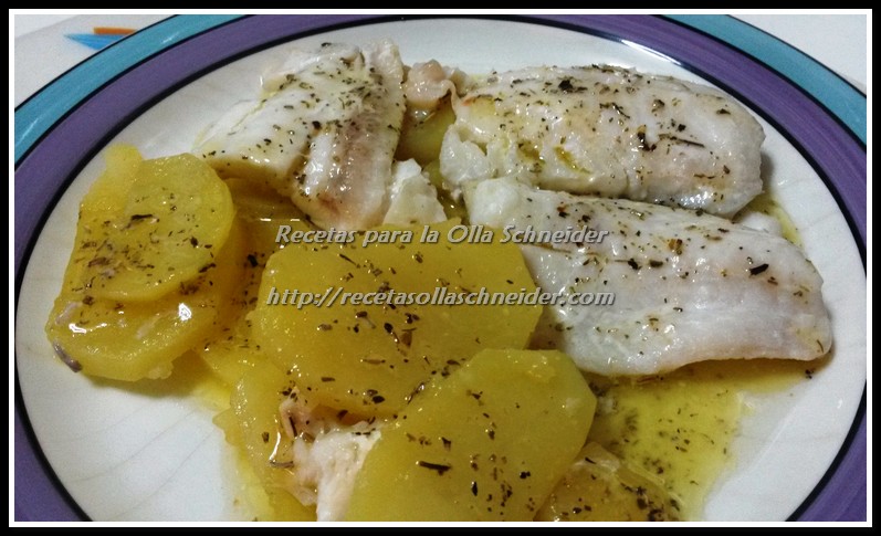 Cuando finalice el programa, servir y echar por encima una mezcla de mantequilla derretida con hierbas provenzales, de manera abundante, que cubra el pescado y las patatas.