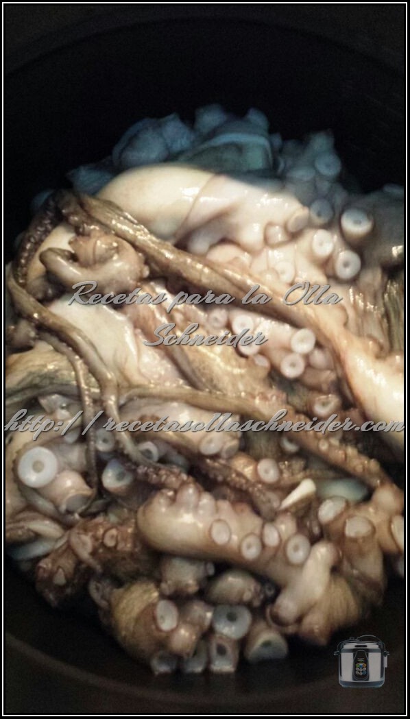 En la cubeta, sin añadir nada de agua, poner el pulpo descongelado y programar menú Pastel (15 min).
