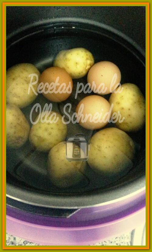 Poner en la olla las patatas pequeñas, enteras, lavadas y sin pelar, y 3 huevos, cubrir con agua.