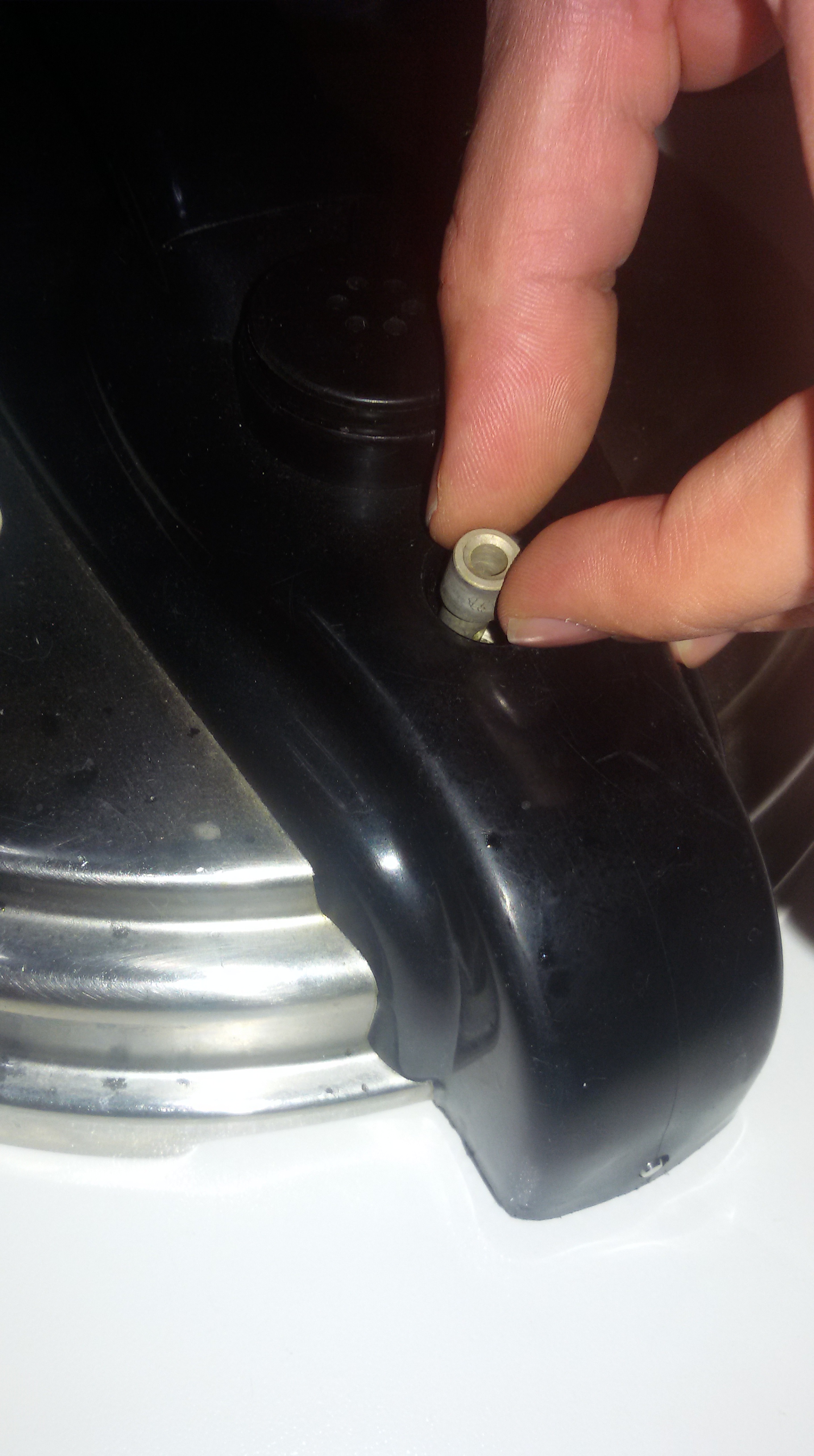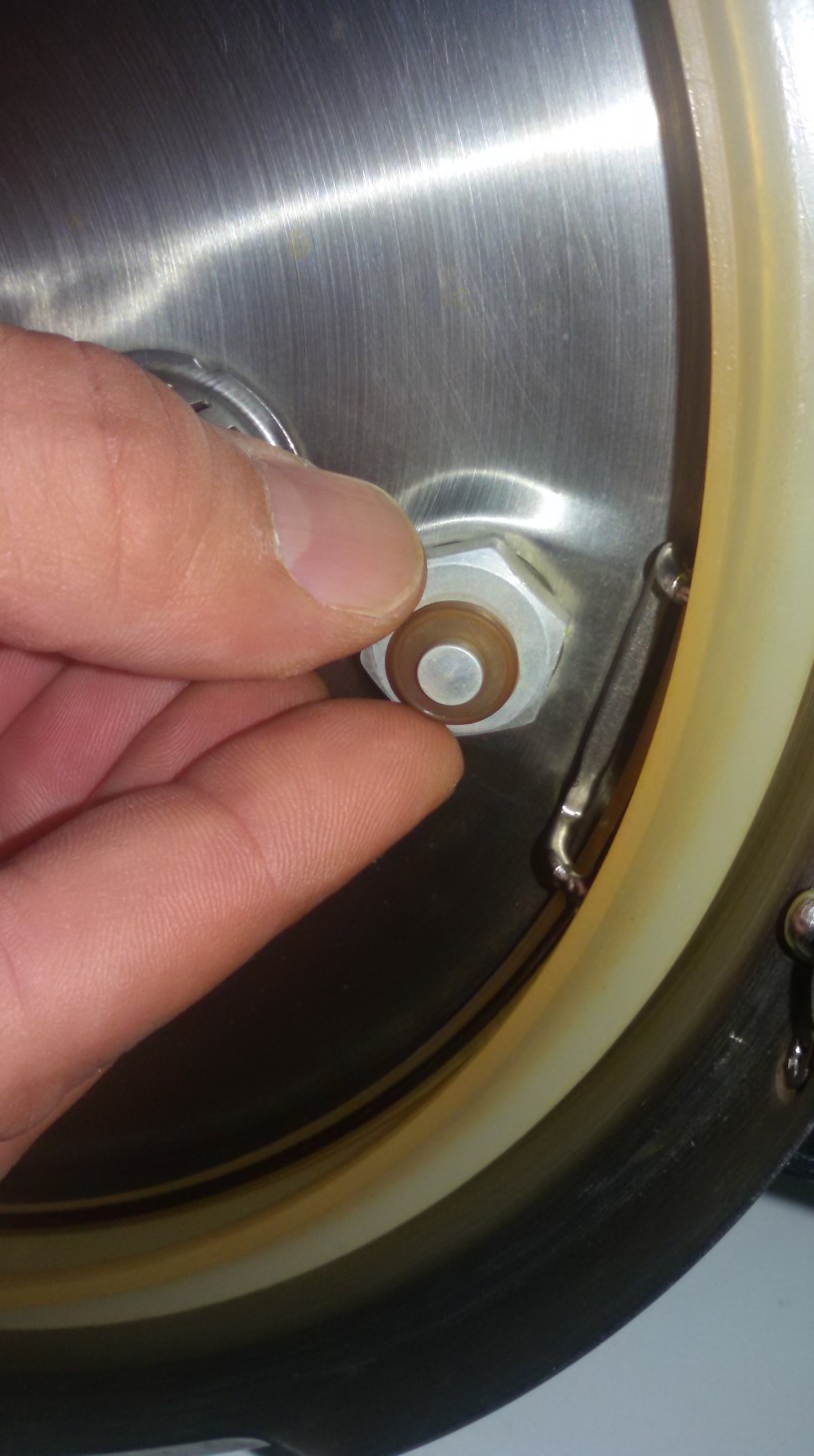 3. Por la parte interior de la tapa, colocar la junta de silicona, de modo que sujete la parte estrecha del cilindro metálico que hemos introducido en el orificio de la tapa en el paso anterior.