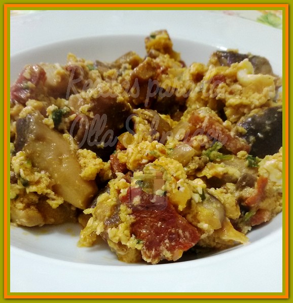 Cuando se haya evaporado el agua, añadir 2 o 3 huevos y remover bien, para romper las yemas y que el huevo se mezcle con el resto de ingredientes.