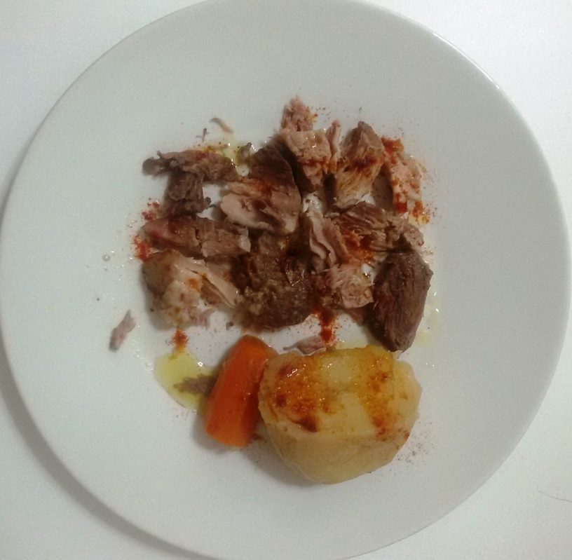 Programar Menú Cocido (25 minutos). Para servir, picar la carne y espolvorear con pimentón crudo y aceite de oliva