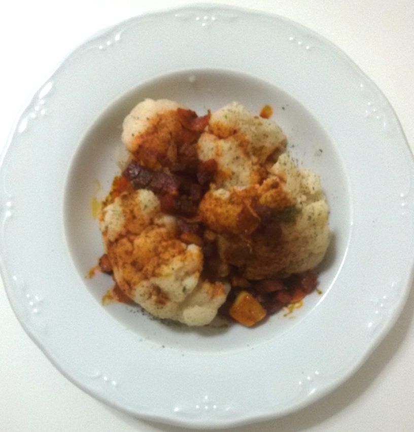 Cuando finalice el programa, sacar con cuidado la coliflor para que no se deshaga, colocar en los platos y regar con el sofrito de pimentón.